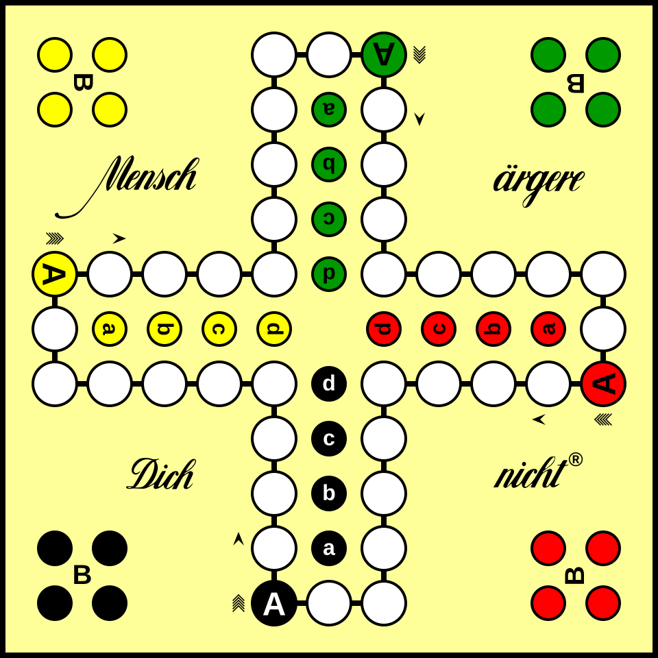 - Für das Spiel wird ein Spielbrett benötigt, dass wie ein Mensch ärger dich nicht aufgebaut ist. Man kann auch ein original Mensch ärger dich nicht verwenden.