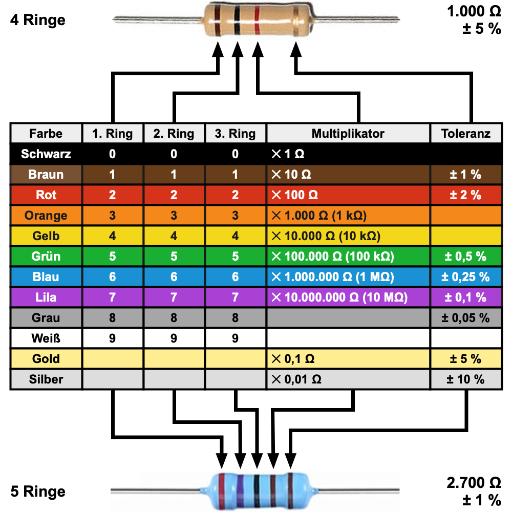 Die für Heimanwendung meistens verwendeten Widerstände haben 2 Anschlußdrähte und ihr Wert ist auf dem Körper mit 4 oder 5 Farbringen codiert: