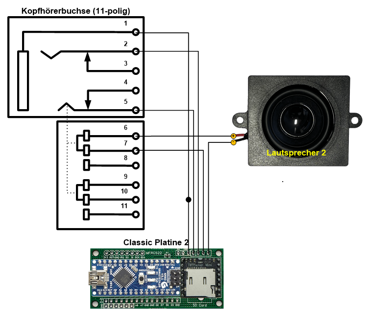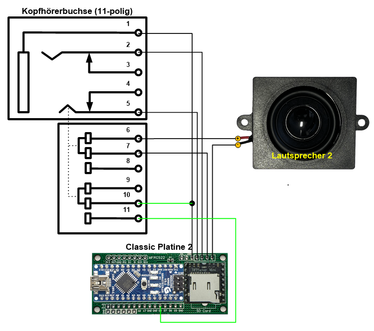 Durch die zusätzlichen Verbindungen ist der TonUINO (ab Firmware Release vom 29.03.2024) in der Lage, zu erkennen, ob ein Kopfhörer eingesteckt ist oder nicht,