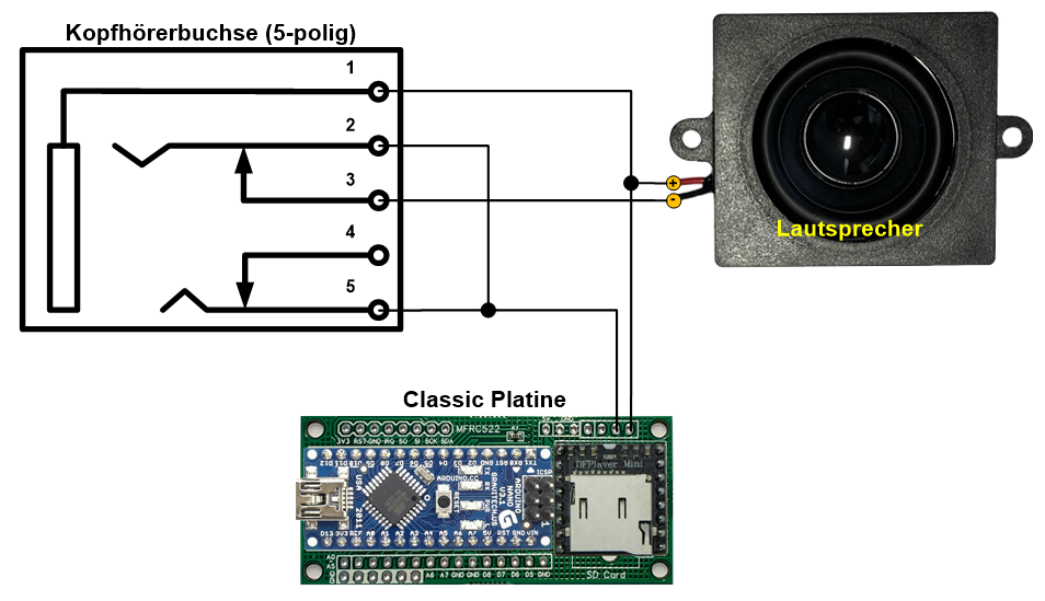 Durch den Einsatz des DF-Players wird jedoch eine besondere "Schaltbuchse" benötigt,