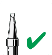 Die Spitze des Lötkolbens sollte zwar fein sein, damit auch kleine Lötstellen gearbeitet werden können, aber dennoch nicht spitz zulaufen, wie ein angespitzter Bleistift. Viel besser ist eine leicht abgeflachte Spitze mit einer ca. 2 mm breiten Auflagefläche. Durch geschicktes Auflegen der Spitze kann ein deutlich besserer Wärmeübergang in die Lötstelle erreicht werden, was einerseits zu qualitativ besseren Lötstellen sorgt, andererseits aber auch weniger (Hitze-)Stress für die Platine und andere Bauteile bedeutet, da die Lötstelle die notwendige Temperatur schneller erreicht.