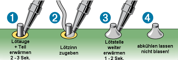 Vorbereitend wird die Lötstelle gereinigt und mit einem "no-clean" Flussmittel benetzt. Danach folgen die 4 Phasen des Lötens (wie auch grafisch dargestellt):