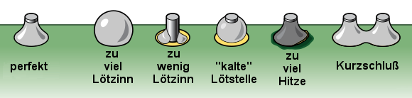 Die Grafik zeigt schematisch die möglichen Ausbildungen des Zinnkegels einer Lötstelle: