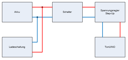 Gezeigt ist hier eine Stromversorgung mit separatem Akku, Ladeschaltung und Spannungsregler als eigenständige Baugruppen,